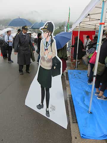 背中に「瑞雲」と書かれた緑色の法被を着た人や眼鏡をかけ海自の略帽を被った少女のキャラクターの立て看板があります。