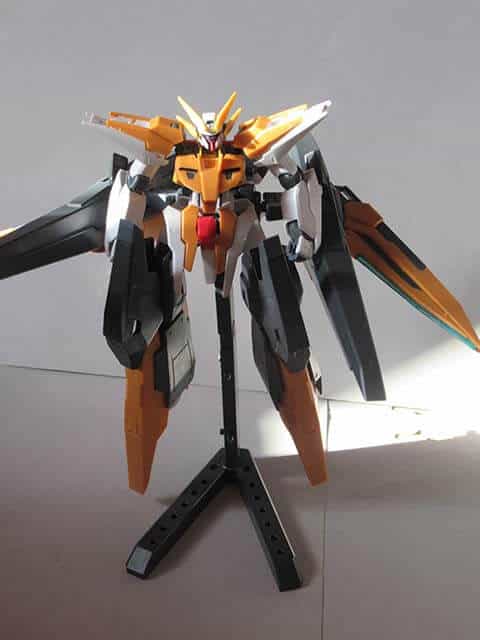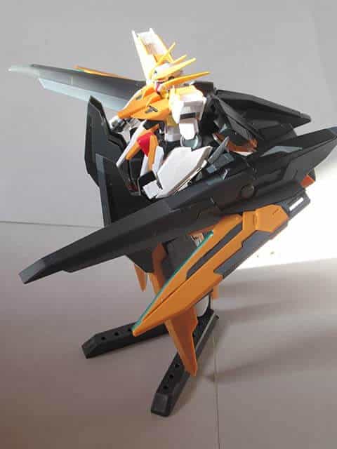 ハルート共通部分の欠点としてはクリアパーツの塗り分けが必要なところが挙げられますが、このシールによってGNソードライフルのクリアグリーン系とノーマルモードの頭部のゴーグル部分の塗装だけで済むのがありがたいところです。ハルート最終決戦仕様は変形も可能ですが、通常モードにあった足の伸縮がなくなっているためかえって変形は簡単と言えます。また、キットには台座もついているのがいいところで飛行形態、MS形態ともに飾ることが可能です。