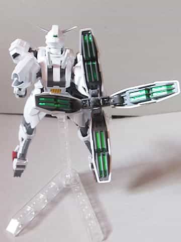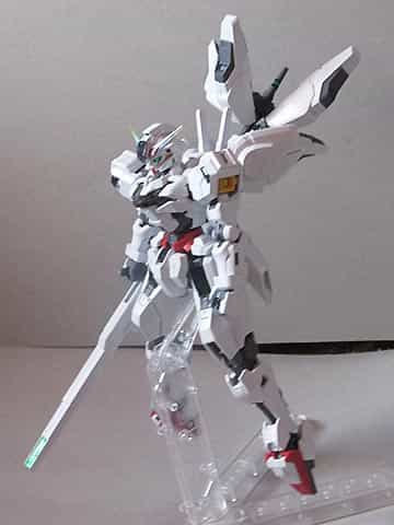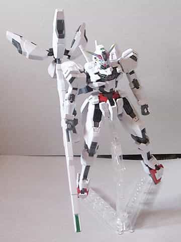ガンダムキャリバーンはエアリアル等と同様ポリキャップ不使用、カラーパターンが印刷されているようなインモールド成形のパーツがついているキットで、台座がつくところもポイントです。ただし、右腕に装備される推進器付きのライフルが非常に大きいため、ややバランスが悪いようです。