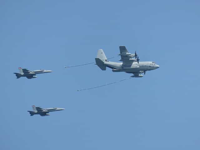FAー18EはMVー22オスプレイやKCー130と共に攻撃任務のデモンストレーションを行いました。