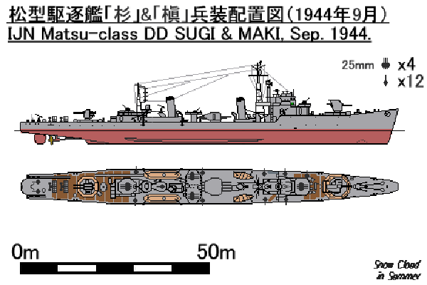 駆逐艦「桐」「杉」は大戦後期に量産された「松」型駆逐艦である。「松」型は32隻が就航したがすべて樹木の名前を付けられたので、いわゆる「雑木林」というあだ名を付けられていた。従来の日本の駆逐艦とは違い機関配置をシフト式にしたため前後の煙突の間隔が離れており、シルエットはどちらか言うとアメリカの護衛駆逐艦に似ていた。