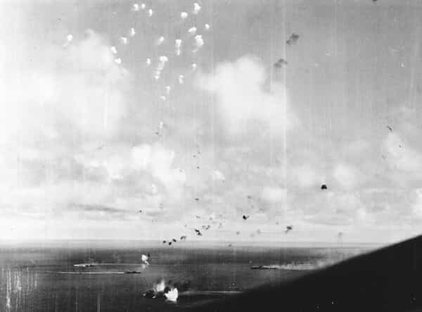 作者 U.S. Navy, photographed from a USS Franklin (CV-13) plane. Copied in 1986 from an original print (photo No.26) in the TG 38.4 action report of 18 November 1944. [Public domain], ウィキメディア・コモンズ経由