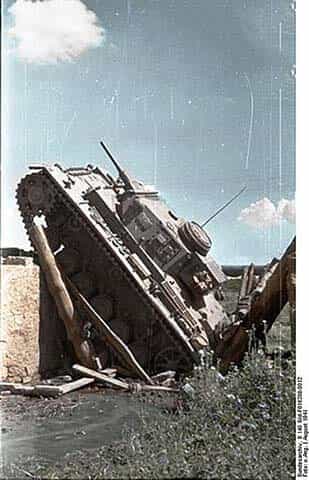 今回紹介するのは、そのようなアクシデントの中から戦車の重さに仮設橋が耐えられず橋の下に落ちてしまった、言い換えると戦車が仮設橋に「負けた」といえるような、そのような戦場写真を紹介したいと思います。