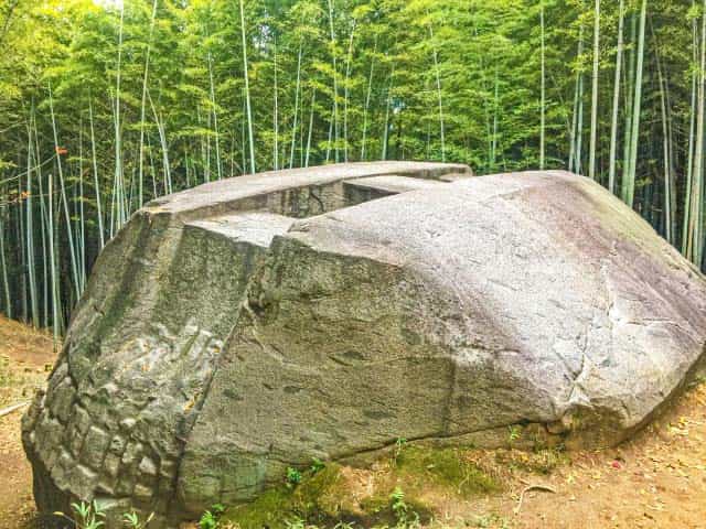 奈良県橿原市の貝吹山の山中にある巨大な石造物です。約800トンの花崗岩の東西方向と上部にかけて切り込みが彫り込まれ、上面には等間隔にくり抜かれた真四角の穴が2つ掘られ、岩の下半分には格子状の溝が掘られています。