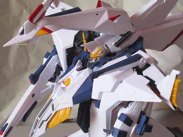 キットはフィックスドフライトユニット(飛行用パーツで外装)と、オデュッセウスガンダム(モビルスーツ本体)に分かれているのですが、オデュッセウスガンダムだけで組み立てられるようにランナー構成がなされており、今後の展開がないとも言えないところが面白いです。改造、グレードアップとして考えられるのがミノフスキーフライト部分(正面から見える背中の黄色部分)などのスリットの彫り込みですが、あまりに面積が多くスミ入れだけで済ましています。