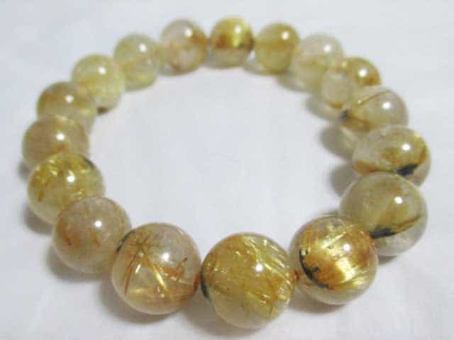 和名は金紅石入り水晶(きんこうせきいりすいしょう)と呼ばれ、水晶の生成過程で二酸化チタン鉱物のひとつである黄金色の針状の結晶(ルチル:=金紅石)を内紛した物のことをいいます。