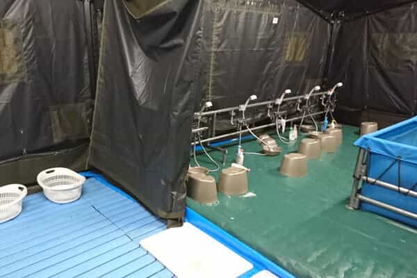 浴場の構造は大型のテントにスノコを敷いて服を入れるカゴに扇風機と冷風器が置かれた脱衣所と浴槽とシャワースタンドがある浴室に分かれている。