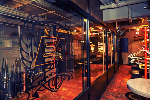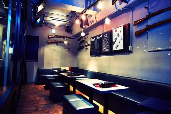 私は店内を見て驚きました。クールでカッコいいバーで薄暗い店内の照明が渋くていい雰囲気でした。しかも、壁にはハンドガンやライフルなどが飾ってあり、その銃の国旗や名称が貼ってあり、内心驚きを隠せませんでした。