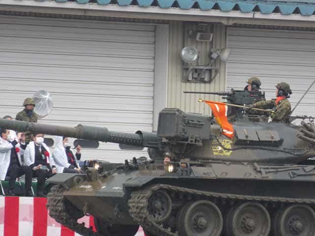 第3戦車大隊の行進は74式戦車と16式機動戦闘車が一緒に行進します。来年の第3戦車大隊解隊の後で第3偵察隊と統合して戦闘偵察大隊になるので、第3戦車大隊には統合を前に機動戦闘車が配備されているのです。