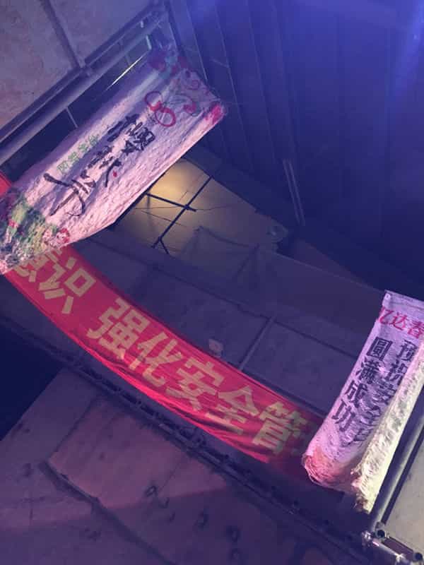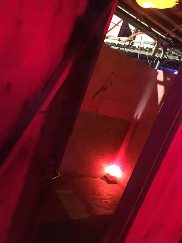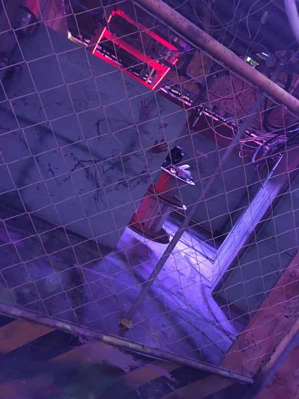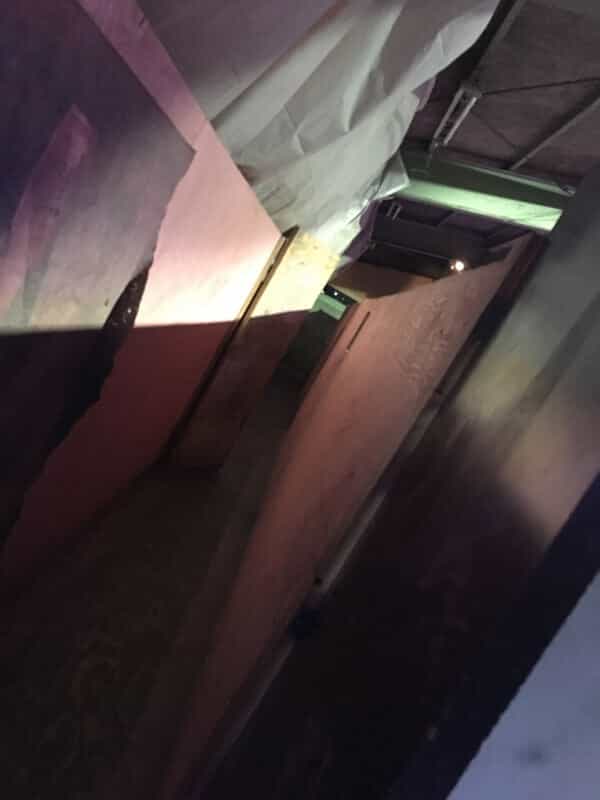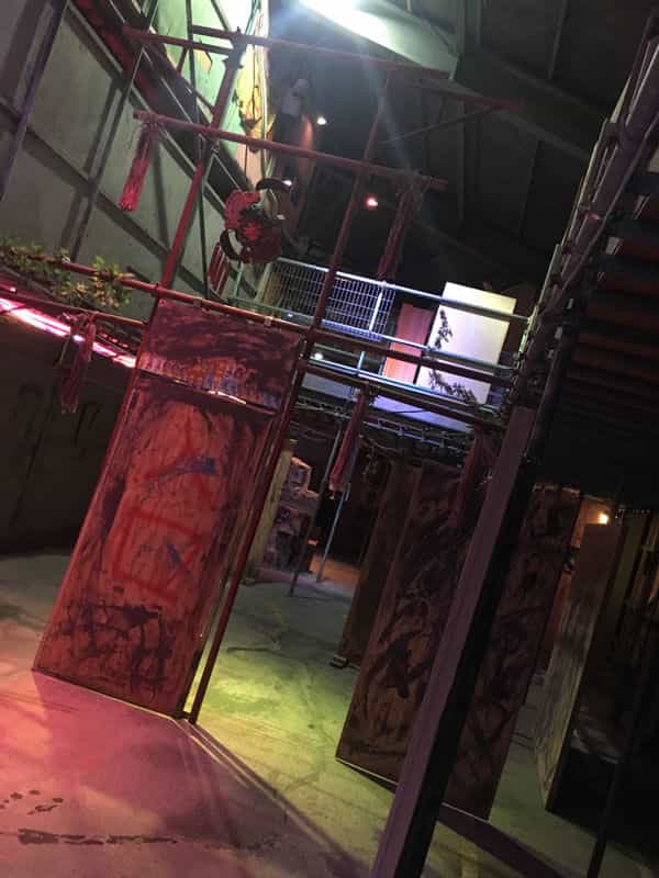 建屋内には工事で使う格子状のバリケードもあるのですが、着目して頂きたいのは格子の後ろの壁にある血糊の手形です。