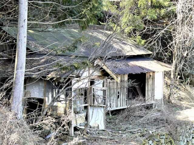 5分程進むと朽ち果てた家が見えてきた。何年くらいここにあるのか、窓ガラスも割れ家全体が傾いている。
