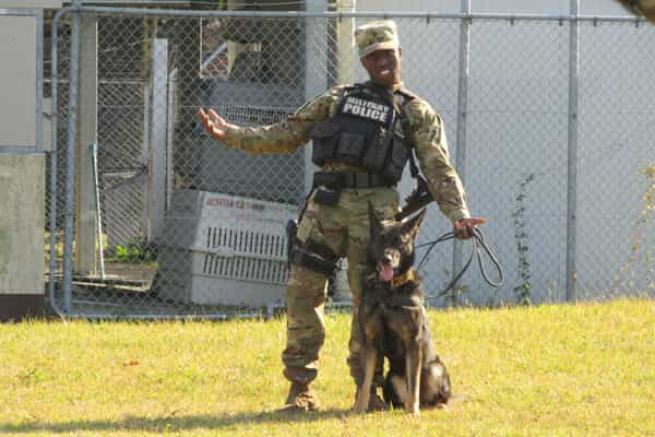 軍用犬の種類や任務について説明を聞いた後で、陽気なハンドラーと軍用犬ユノ君が実演を始めます。
