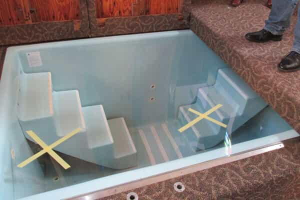 床のブロックを持ち上げると洗礼用のプールが出てきます。