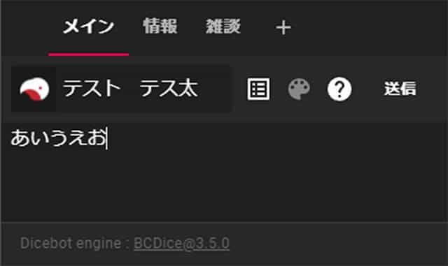 右下のテキストボックスにコマンドを入れて送信するとダイスが振れます。