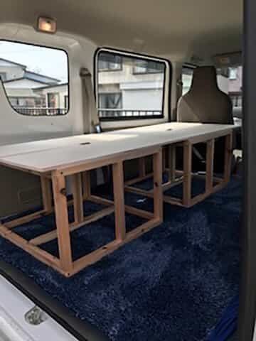 まずは日曜大工で収納と寝床を兼ねたベッドを自作、荷台のスペースにちょうどいいサイズのラグをニトリ購入し、これでとりあえず寝泊まりは出来ます。