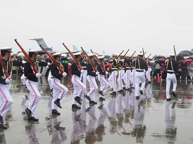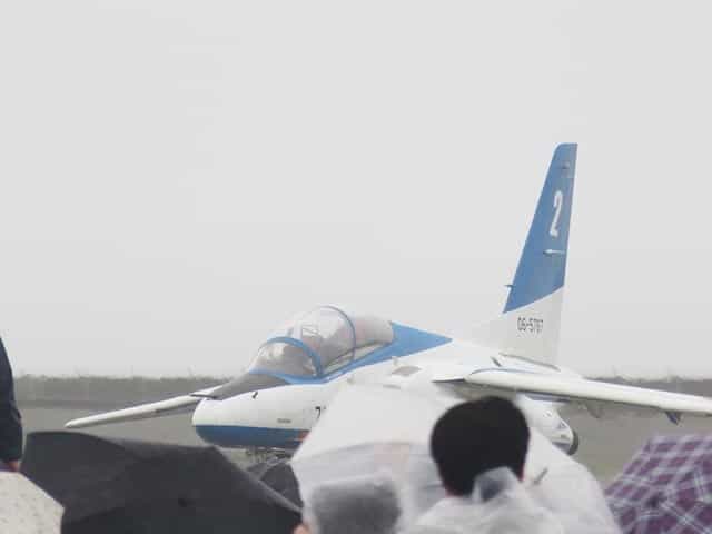 この低い雲とまた降り出した雨は、航空自衛隊のアクロバットチームブルーインパルスの演目が地上滑走のみで終わりとなりました。