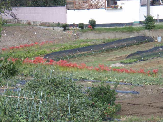彼岸花が植えられた場所は、畑の周囲や寺院が多い。