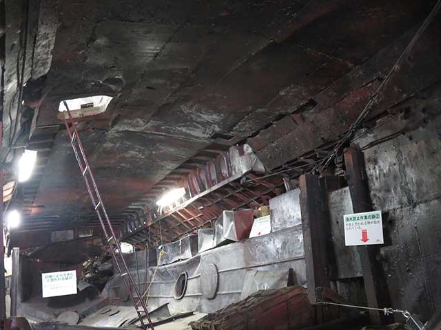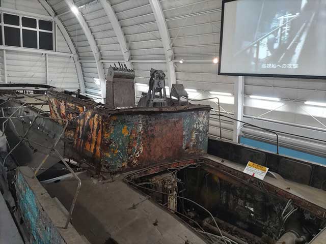 横から後ろからと上からも眺められる工作船は自爆による損壊の後も見られる。高速で航行するためのエンジンを4基も備え後部は小型船が格納できる独特な構造、多くの武器を積み込んだ戦闘力の高さがある工作船の実態に不気味さを感じさせます。