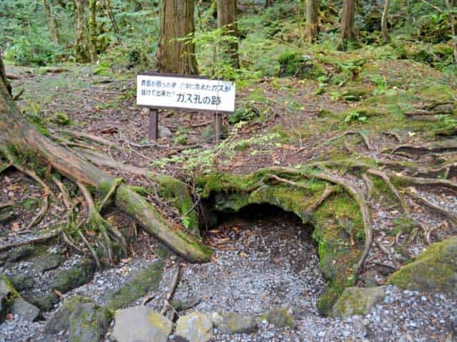 樹海が形成されるとき、溶岩が立木に押し寄せたり、倒れた気に大きかぶさったりします。その木の熱で木が焼けてなくなったり、長い時間で木々が朽ち果てたり、他にも噴火の後の地中に溜まったガスが噴出したりで、樹海特有の穴が出来上がります。小さい物から這い上がる事が不可能な深さ、目視できるものばかりでなく樹木や枯葉などが覆いかぶさり、天然の落とし穴の状態もあって危険です。