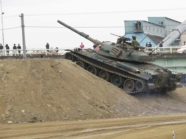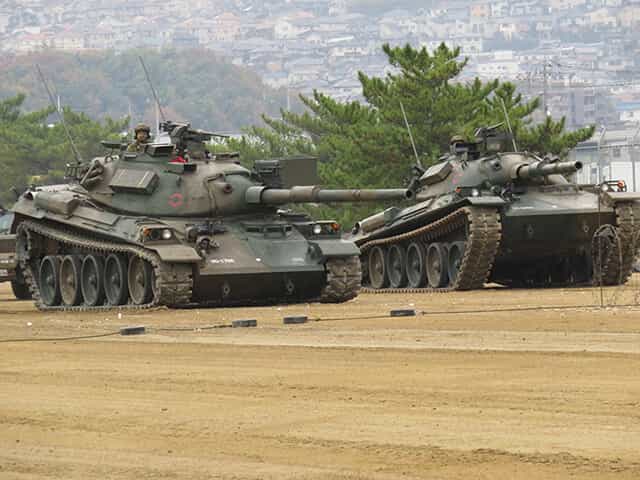式典の後の訓練展示は自衛隊と交戦して後退する敵役の74式戦車と軽装甲機動車が慌ただしく後退する場面から始まり。