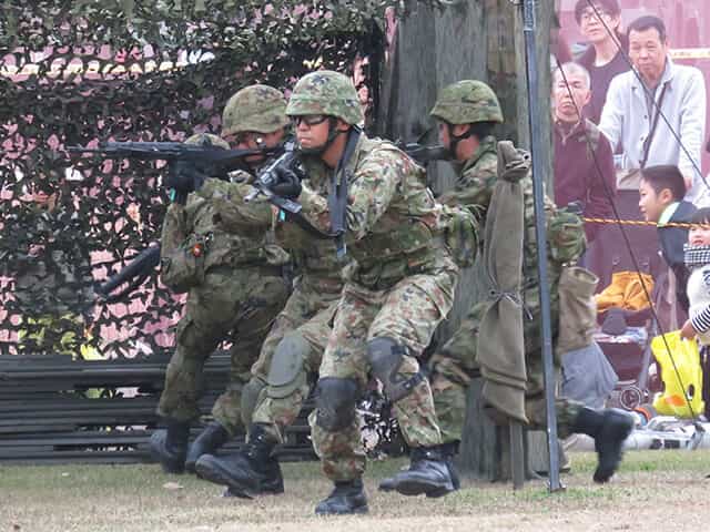 UH-1ヘリから降下したレンジャー隊員が敵役の隊員を格闘で倒したり、2両の74式戦車が油圧装置で前後にどう傾くかを実際に見せていたり、施設科隊員が地雷の捜索をしていたり、終盤では10人または20人ぐらいの大人数で並び小銃の一斉発砲(空砲)を行うと言う例年以上の見所がありました。