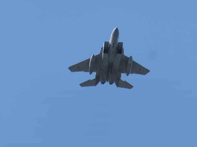 観閲行進では最後の飛行展示で航空自衛隊新田原基地からF-15が祝賀飛行で飛来しました。