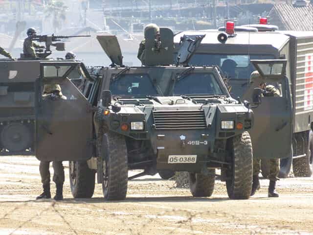 自衛隊が反撃する時に通る進路上の障害物が無いか施設科の隊員が偵察して障害物を発見して92式地雷原処理車が処理作業を行う場面
