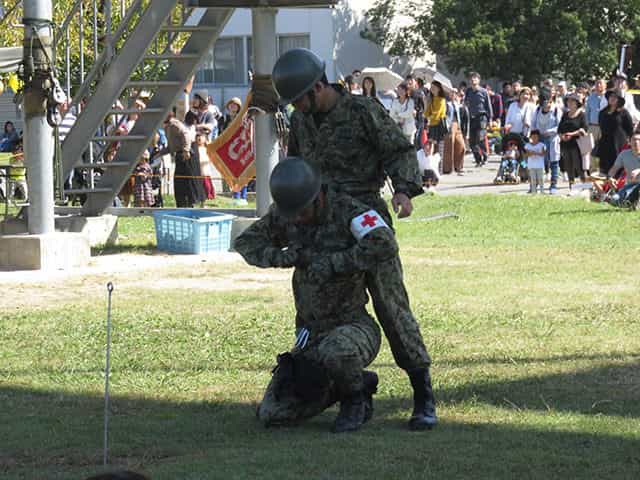 救助するレンジャーの展示は衛生隊員が負傷者を背中に背負いロープで自分の身体と結んで急な坂をゆっくりと降りる様子を見せてくれた。
