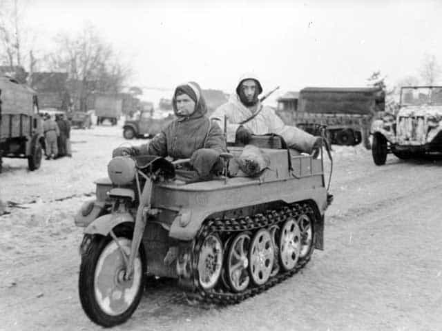 更にマニアックな方ならばこのSd.Kfz.251ハーフトラックの構成と同様に、前方がオートバイ、後方が履帯となっている小型車輛「ケッテンクラート」の名を、その代表として選択するかも知れない。