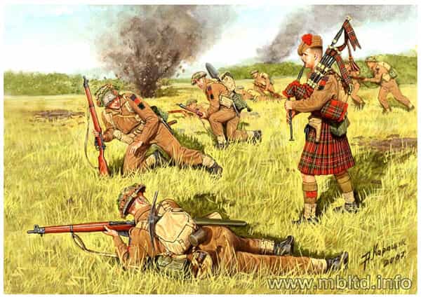 スコットランドでは戦闘の最前線で「バグパイプ」はで吹き鳴らし、演奏者が倒されても、他の兵士が「バグパイプ」を拾って吹き鳴らすという伝統が近代戦でも受け継がれ、「バグパイパー」は勇気と尊敬と伝統の象徴。というシーンの再現なんですが・・・