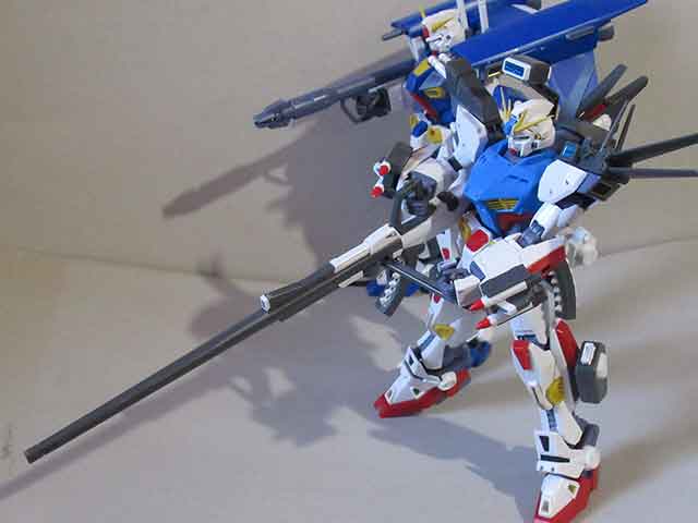 F90のミッションパックの旧キットはすべて一色成形だったのですが、MGともなると色分けが非常に進んでおり、当時のキットを思い出すと感動があります。ただし、塗装が不要ということではなく、ミサイルの先端の赤い部分、ライフル後端の赤い部分、エネルギーパックの上部の白い部分などは塗装が必要です。
