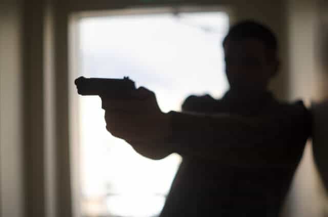 38口径の弾丸は標的の首を貫通。目撃者の証言によると、店内にパン、パンという音が突然響いたあと、客の一人が腹をおさえ、もう一人が肩をおさえてその場にくずおれた。