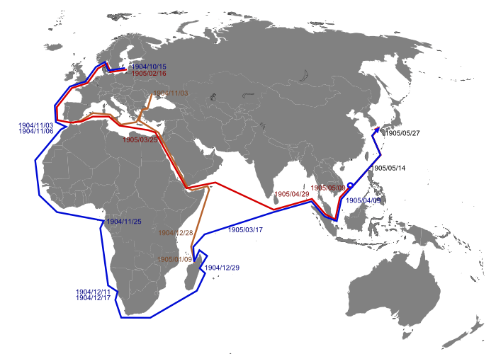 これに激怒した英国は支配下にあるスエズ運河のロシア艦隊の使用を拒否。その為ロシア艦隊はアフリカ喜望峰回りという途方もない遠距離航海を強いられました。