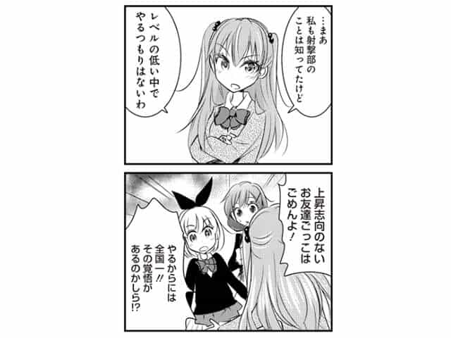 早速射撃部に行きますが、廃部になっていて衝撃を受けます。しかし、中学校の試合で一緒だった子達が運よく同じ高校に居たのでした。