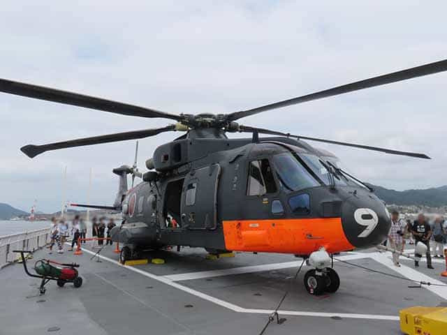 「しらせ」後部のヘリ甲板では搭載しているMC-101掃海・輸送ヘリコプターが置かれ、ドアも開けられていたので機体内部も見られました。