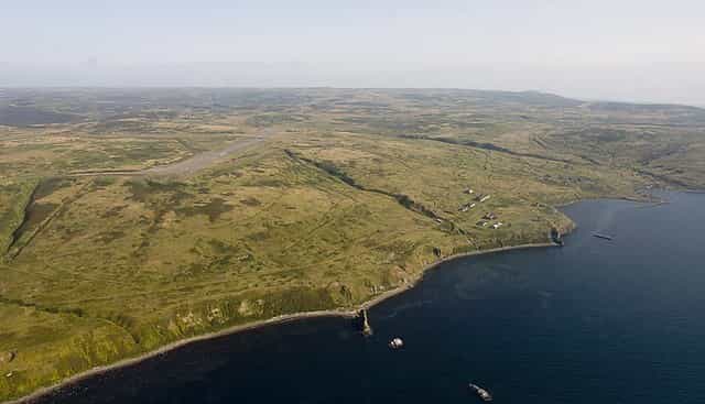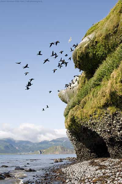 ■占守島の海岸とウ。左奥に幌筵島の柏原付近が見える