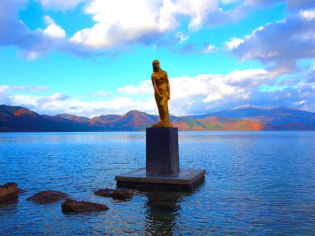 湖畔には象徴ともいえる黄金の辰子像が静かに佇み、雄大な湖面に黄金の身体が相まって、美しくも神秘的な雰囲気を醸し出しています。