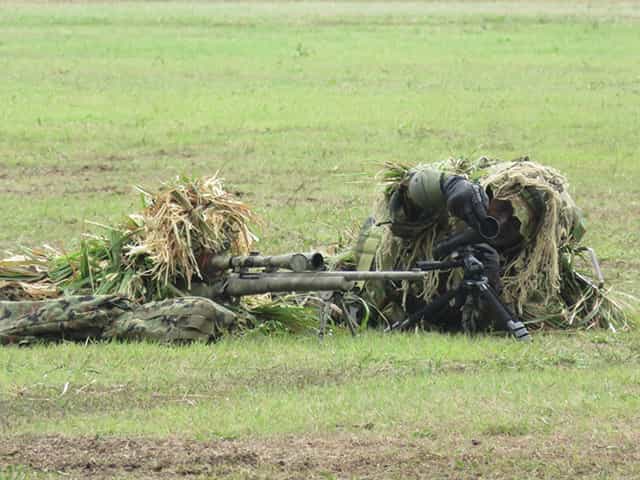 偵察により敵部隊の指揮官を発見したレンジャー隊員は狙撃を行う隊員へ位置を報せます。