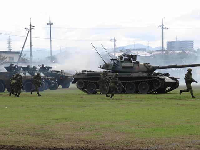 指揮官を失った敵部隊へ野戦特科の155ミリ榴弾砲による砲撃に前進した74式戦車が攻撃に加わり、普通科隊員が突撃して占領された地域を奪還します。