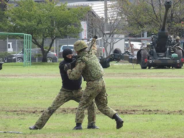 最初は両手を上げて降伏の意志を示した敵がいきなり陸自隊員に掴みかかり格闘戦になると言う流れです。