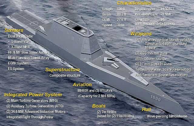 実装されるレーダーや火器管制システムは、アメリカのレイセオン社が核となって開発されたもので、兵装としては巡航ミサイルのトマホークや対空用の垂直発射装置などを搭載しています。ハイテクノロジー満載のこの軍艦は、乗組員の数も約170人程と、従来のイージス艦の半数とされています。